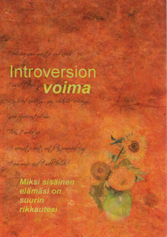 Yhteiskunnastamme on tullut ulos- ja ylöspäinsuuntautunut, valtaava, rakentava, kilpaileva, ostava, edistyvä – ekstrovertti. Kitisevät pyörät rasvataan, torkkujat häviävät, paras joukkue voittaa ja voittaja saa kaiken. Ei ole ihme, että tässä kilpailun kulttuurissa introvertit ahdistuvat. Meitä painostetaan osalllistumaan ja pysymään perässä, kun mieluiten seuraisimme sisäistä ääntämme. Meihin juurtuu syvälle tunne siitä, että olemme jotenkin vääränlaisia ja ettei meillä ole muuta vaihtoehtoa kuin opetella ekstroverteiksi, mennä maan alle tai seota. Pienestä asti meidät opetetaan arvostamaan sosiaalisia taitoja. Meitä kehotetaan olemaan ystävällisiä, harjoittamaan small talkia ja hankkimaan ystäviä. Mutta kuinka moni on opetettu puolustamaan omia rajojaan, kehittämään mielikuvitustaan ja olemaan yksin? Kuinka moni on opetettu vetäytymään sosiaalisista riennoista ja vaalimaan mielen sisäistä todellisuutta? Tämän kirjan on tarkoitus toimia tuona puuttuvana koulutuksena ja tukena ja tarjota vaihtoehto sille ekstroverttikoulutukselle, jota olemme saaneet koko elämämme ajan. Introvertteja kehotetaan luopumaan vanhoista ajattelutavoistaan ja olemaan sen jälkeen rohkeasti omia itsejään. Kun introvertit valtaavat sisäisen todellisuutensa takaisin, he huomaavat maailmansa muuttuvan. Kun introvertit vetäytyvät sisäiseen todellisuuteensa, he voivat saada aikaan sellaisia ideoita, luomuksia, ratkaisuja ja puhtaita totuuksia, että ne saavat muut mykistymään. Introversio on vaalittuna rikkauden lähde. Se on voimaa, joka muuttaa maailmaa.